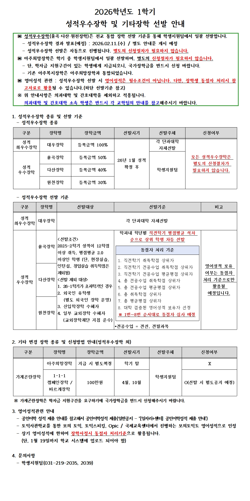 [공지] 2026학년도 1학기 성적우수장학 및 기타장학 선발 안내