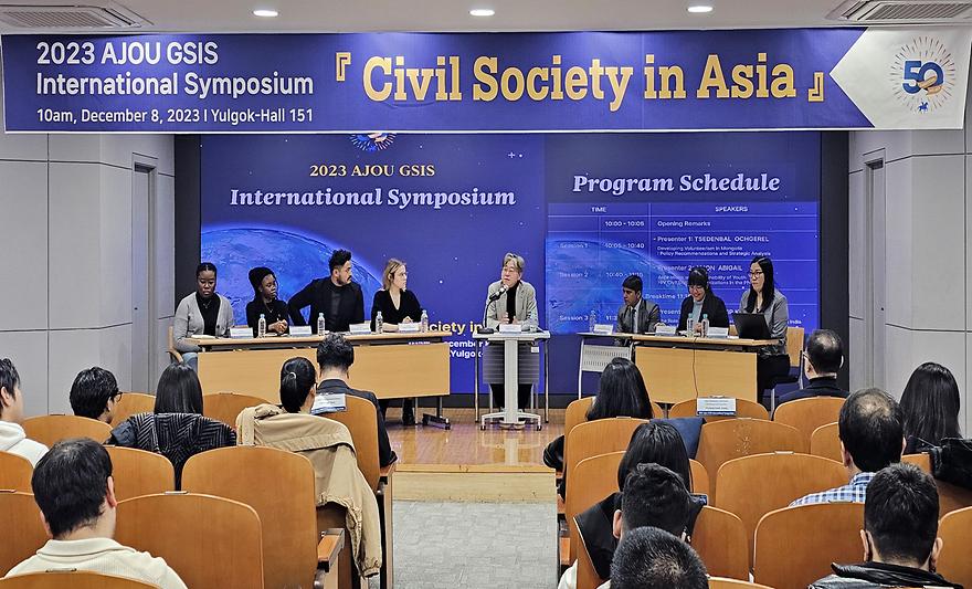 The Graduate School of International Studies at Ajou University has held an international symposium themed as “Civil Society in Asia.” Held in the Media Conference Room in the Yulgok Building on the 8th, the symposium rallied students of the Graduate School of International Studies for presentations and discussions. The academic event opened with an address by Chang Byeong-Yun, Dean of the Graduate School of International Studies. The first presentation was given by Ochgerel Tsedenbal, a civil sociology student, on “Developing Volunteerism in Mongolia: Policy Recommendations and Strategic Analysis.” The second presentation was given by Abigail Amon, also a civil sociology student, on “Aspirations and Sustainability of Youth HIV Civil Society Organizations in the Philippines.”The third and last presentation was given by Ram Pravir Kumar, another civil sociology student, on “The Role of Civil Society in Consolidating Democracies in India and the Republic of Korea, 1991-2021: A Case Study.”The presentations were followed by student discussions involving a panel made up of students McKenzie Antonette Gooding, Annie Favour Chioma, Kevin Orlando Roa Gomez, and Veronika Basiuk engaged in Q&A and discussions with the students that had given the presentations. The discussions were moderated by Kang Shin Goo, Professor of Political Science at the Graduate School of International Studies.Since the first Ajou GSIS International Symposium was held in 1997, the Graduate School of International Studies has continued the tradition every year as an opportunity for international students to share insights that can help with their studies and personal and academic growth.Established in 1996, the Graduate School of International Studies at Ajou University has produced around 1,300 graduates to date. The graduates, from 77 countries, are today active in their respective fields around the world. The Graduate School of International Studies at Ajou University currently offers programs in International Business, International Trade, International Development and Cooperation, NGO Studies, Energy Studies, and Civil Society Studies.