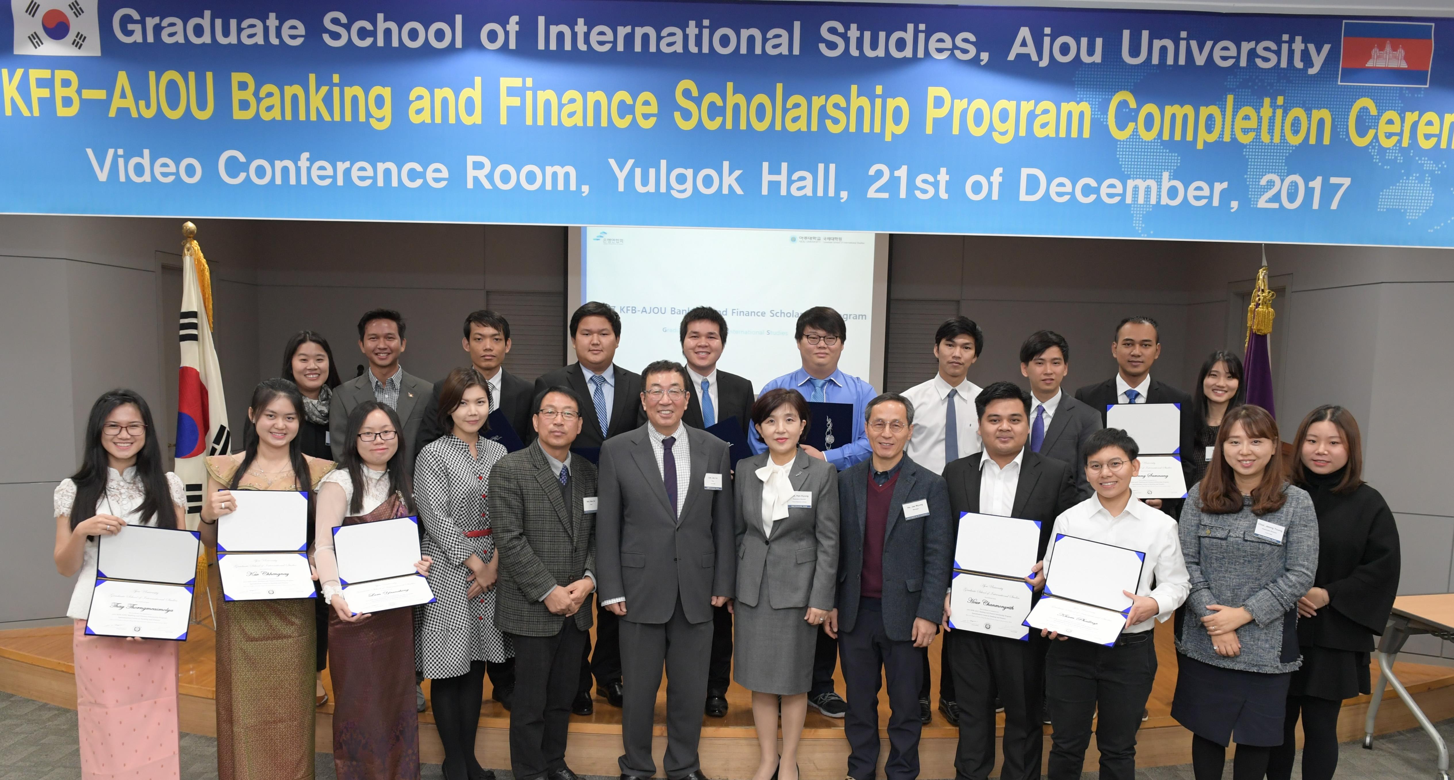 우리 학교 국제대학원이 수료식을 개최했다. 이 프로그램은 캄보디아에 진출한 한국계 은행들의 현지 신규 인력 확보를 위해 마련되었으며 아주대학교와 은행연합회의 협약에 의해 올해 첫 운영을 시작했다. 지난 21일 율곡관 영상회의실에서 열린 수료식에는 에 참여한 14명의 학생이 참석했다. 학생들은 10주 동안 우리 학교에서 금융 리스크 및 금융 관련 IT 지식을 공부했다. 앞으로 캄보디아 프놈펜 소재 한국계 은행에서 3개월 동안 인턴으로 근무할 예정이다. 수료식은 프로그램 참가자들의 활동 보고로 시작해 우리 학교 국제대학원 임재익 원장의 수료식사와 은행연합회 김혜경 상무이사의 축사로 이어졌다. (재)수원시국제교류센터 노만호 센터장도 수료식에 참석해 학생들을 독려했다.올해 10월부터 운영을 시작한 이 프로그램은 캄보디아에서 영업을 확장하고 있는 한국계 은행들의 현지 신규 인력 확보를 돕기 위해 기획됐다. 훌륭한 현지 인재를 양성해 캄보디아 경제 발전 및 한국계 은행의 캄보디아 내 금융사업 확장에 기여하겠다는 목표다. 이를 위해 전국은행연합회가 3년간 총 1억8000만원의 장학금을 지급하고, 아주대학교가 학생들의 기숙사비를 제공한다. 임재익 국제대학원 원장은 이 날 축사를 통해 “10주 교육을 훌륭히 마친 14명의 캄보디아 장학생들에게 축하의 마음을 전한다며 “남은 3개월의 현지 한국계 은행 인턴 과정에 열심히 임해 한국과 캄보디아를 잇는 진정한 글로벌 금융 인재로 성장하길 바란다”고 말했다.