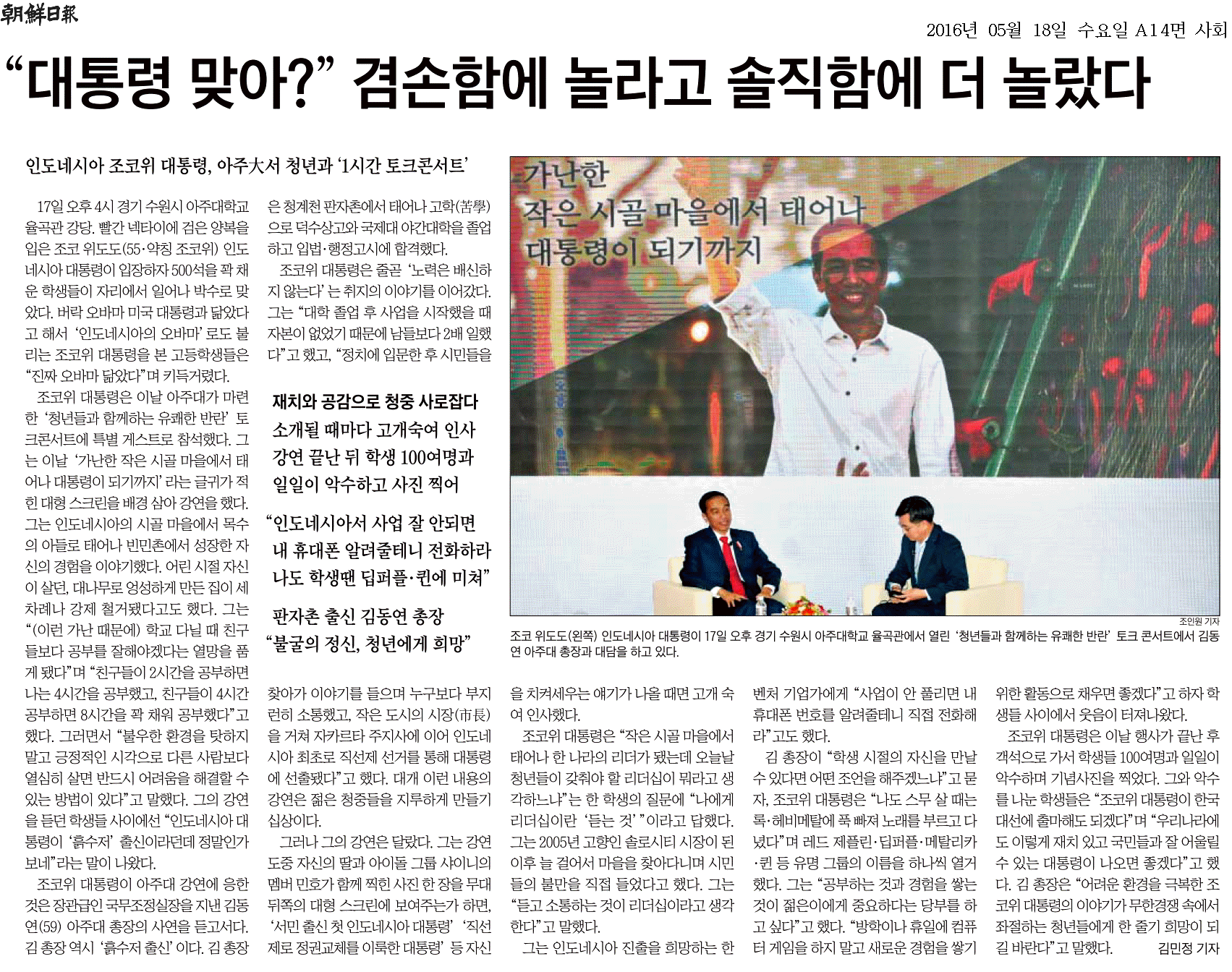 우리 나라를 국빈 방문 중인 인도네시아 조코 위도도(Joko Widodo) 대통령이 우리 학교에서 김동연 총장과 ‘청년들과 함께하는 유쾌한 반란’ 토크 콘서트를 열었다. 17일 오후 우리 학교 율곡관 대강당에서 열린 행사에는 우리 학교 학생과 인도네시아 유학생, 수원 지역 고교생 등 500여명이 참석했다. 남경필 경기도지사, 염태영 수원시장, 박광온 국회의원을 비롯한 지역 인사와 경제인도 함께 자리했다. 조코 위도도 대통령은 작은 시골마을에서 태어나 인도네시아 역사상 최초의 직선제 정권 교체를 이룬 첫 서민 출신 대통령이다. 우리 학교 김동연 총장도 상고를 졸업한 소년가장으로 야간대학을 나와 장관과 총장에 이른 입지전적인 인물. 이에 조코 위도도 대통령은 김 총장과 아주대가 추진 중인 ‘유쾌한 반란’에 대해 공감하면서 양국 청년들에게 꿈과 희망의 메시지를 전하고자 이번 토크 콘서트를 진행하게 됐다. 1시간 가량 진행된 토크 콘서트에서는 ▲꿈과 희망, 그리고 리더십 ▲소통 철학과 노하우 ▲청년들에게 보내는 조언 ▲아시아 시대 도래에 따른 양국의 교류·협력 등의 주제가 다뤄졌다. 조코 위도도 대통령은 “강가 작은 마을의 목수 부모님 밑에서 태어나 자라면서 여러 어려움이 있었다”며 “가난하고 부족한 스스로에 대해 잘 알았기에 다른 친구들 보다 2배, 3배 열심히 공부했고 젊은 시절 가구 사업을 할 때에도 밤을 새워 일하는 날이 많았다”고 말했다. 조코 위도도 대통령은 이어 “학교에서 배우는 것 뿐 아니라 삶에서 경험을 통해 배우는 것이 무척 중요하다”며 “가족, 친구를 비롯한 주변 사람들의 이야기를 ‘경청’하고 방학이나 휴일을 통해 다양한 경험을 쌓아 보라”고 조언했다. 그는 현장에서 답을 얻는 본인의 업무 스타일에 대해 소개하며 현장에서 사람들과 직접 이야기를 나누다 보면 그들이 어떤 어려움을 겪고 있는지 알 수 있고, 이를 통해 해결책을 도출하게 된다는 설명도 덧붙였다. 조코위 대통령은 인도네시아에 진출하고자 하는 한국 기업에 대한 조언을 청한 한 젊은 기업인에게 “최근 진행된 경제 개혁으로 외국 기업들의 투자 절차가 매우 간단해 졌다”며 “관련 기관에서 불친절한 응대를 받았다면 전화번호를 줄 테니 나에게 직접 연락해달라”고 답하기도 했다. 김동연 총장은 “조코 위도도 대통령은 여러 어려움 속에서도 강철 같은 의지와 집념, 그리고 따뜻한 마음과 탁월한 리더십으로 오늘날의 자리에 까지 오신 분”이라며 “한국 청년들 뿐 아니라 인도네시아를 비롯한 전세계 젊은이들에게 훌륭한 롤 모델이 될 것”라고 전했다. 이번 토크 콘서트는 우리 학교와 아시아기자협회(Asia Journalist Association, AJA), 아시아엔(AsiaN)이 공동으로 주최했다. 한편 본행사에 앞서 조코 위도도 대통령은 아시아기자협회로부터 「아자 어워드(AJA Award, 자랑스런 아시아인상)」를 수상했다. 아시아기자협회는 “조코 위도도 대통령이 인도네시아 대통령으로 취임한 이후 부패근절과 정치개혁 등을 통해 인도네시아를 아시아의 모델국가로 만들고 있는 점을 높이 평가했다”고 선정이유를 밝혔다.
