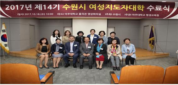 [평생교육원, 수원시] 제14기 수원시여성지도자대학 수료식 개최 10월 18일, 제14기 수원시여성지도자대학 20주간의 여정을 끝내고 수료를 맞이했다. 수원시여성지도자대학은 14년간 지속적으로 주관하고 있으며 수원시 거주하는 여성을 대상으로 21세기 리더로 활동할 수 있도록 다양하고 특화된 교육을 통해 정치, 사회 참여동기를 부여하며 여성리더로서의 리더십을 키워갈수 있도록 운영하였다. 제14기 수원시여성지도자대학은 총 17개 강좌로 진행된 본 과정은 평생학습의 필요성을 느끼게 했던 교육대학원 최운실 교수의 첫강의를 시작으로 인문대 박만규, 교육대학원 김주후, 의과대학 박샛별, 심리학과 김완석 교수 등 본교 교수진의 내실있는 강의와 소설가 강진, 경기도 선거관리위원회 주선미 교수, 출판전문가 송숙희 강사 등 외부 전문가들의 특강으로 진행되었다.이번수료식은 이성엽 평생교육원장의 기념사, 엄태영 수원시장의 영상축사로 시작되었고, 이어 수원시 여성리더회 김미선 총회장 격려사가 진행되었으며 수원시 여성정책 장동훈과장, 박세준팀장, 김진옥 주무관을 비롯하여 수원시 여성리더회 10명의 차기회장들과 임원들이 자리를 참석하여 빛내 주었다.총 59명 원우 중 85%이상인 50명이 수료하였으며 개근상은 김윤정 외 9명이 수상하였고 또한 부단히 14기 교육생들은 이끌어준 김춘녀 회장이 공로상을 수상하였다. 교육 과정 중 각각의 주제를 정하여 팀를 편성한 후 팀별 활동을 진행하였고 그 결과를 수료식에서 발표하여 시상을 진행 하였다. 대상은 자기개발조 황은숙 원우 외 9명 그리고 최우수상 지역문화조 장일연 외 9명, 우수상은 여성정책조 박덕례외 7명이 수상하였다.제14기 수원시여성지도자대학을 수료한 원우들은 함께한 배움이 즐거워지고 그 시간이 가장 행복한 시간 이였기에 감히 감사의 말을 전한다고 소감을 밝혔다. 제15기 수원시여성지도자대학은 18년 5월에 개강할 예정이며 자세한 사항은 아주대학교 평생교육원(031-219-3583)으로 문의하면 된다.