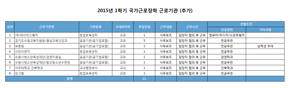 2015년 1학기 국가근로장학 모집 (추가)
