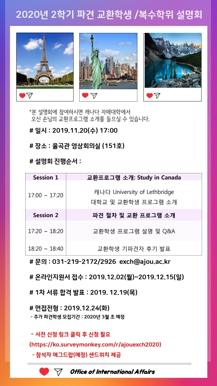 [국제교류팀]2020년 1학기 파견 일반(3차) 교환학생 & 중국 특별 교환학생 1차 합격자 발표 및 면접 안내